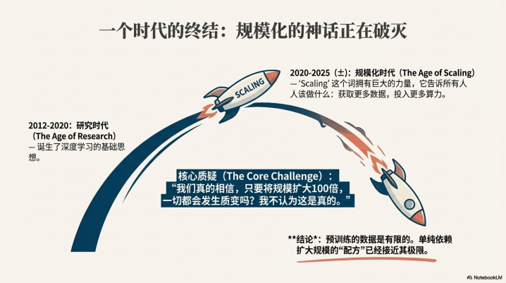 这是Ilya本次访谈中最具穿透力的技术洞察。他将AI的发展划分为两个截然不同的阶段: