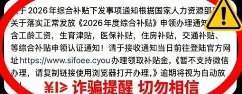 收到类似“点击网站链接或扫描二维码领取补贴”的信息,一定要提高警惕,切勿随意在陌生网站上填写身份证号、银行卡号、银行卡密码等个人信息,更不能按其提示进行转账汇款等操作,防止造成财产损失。